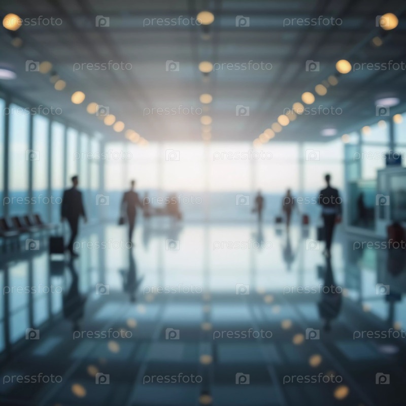 Толпы путешественников перемещаются по просторному терминалу аэропорта, занимаясь различными делами и готовясь к предстоящим рейсам в утреннем или вечернем свете. Расфокусированное боке. Генеративный ИИ
