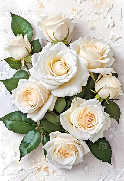 Потрясающая композиция из белых роз разного размера, подчеркнутая свежими зелеными листьями. Этот букет добавит очарования и элегантности любой обстановке, идеально подходит для празднования особых моментов. Генеративный ИИ