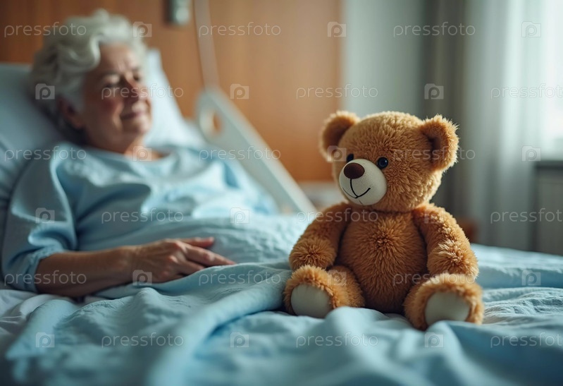 В тихой больничной палате пожилая женщина удобно отдыхает в своей постели, находя компанию в мягком плюшевом мишке рядом с собой. Нежные объятия медведя дарят утешение в трудные времена