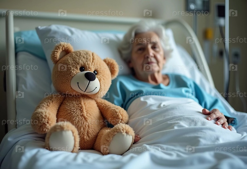 Пожилая женщина лежит на больничной койке, окруженная мягким уютом плюшевого мишки, символизирующего тепло и товарищество в моменты трудностей и одиночества