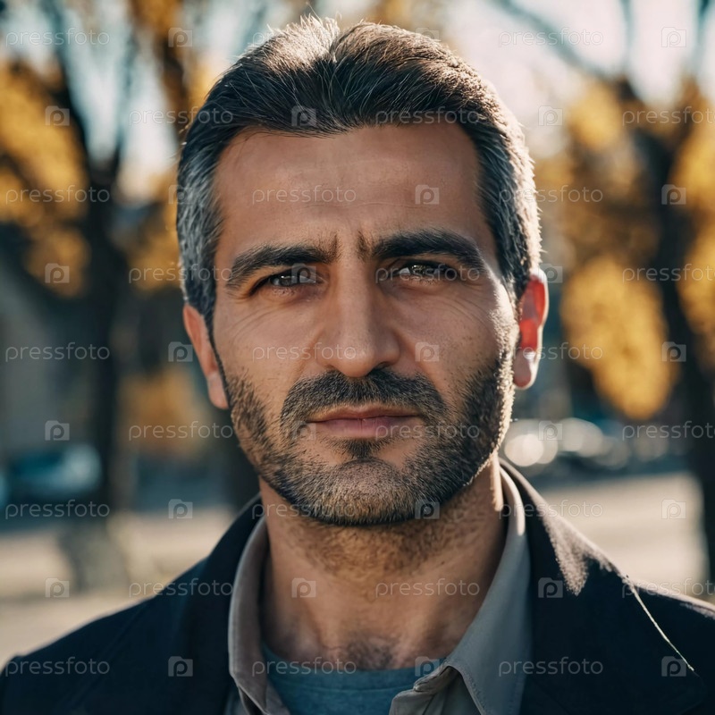 Среди золотистых оттенков осенней листвы гордо стоит сильный армянский мужчина, излучающий уверенность и решимость на оживленном городском фоне, наполненном энергией