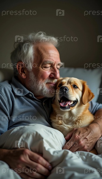 Старик широко улыбается, обнимаясь со своей счастливой собакой в мягкой постели. Уютная атмосфера излучает тепло, воплощая любовь и товарищество в их безмятежный полдень