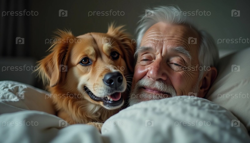 Пожилой мужчина лучезарно улыбается, а его пушистый друг уютно устроился рядом с ним, оба завернувшись в мягкие одеяла, наслаждаясь безмятежными моментами любви и дружбы в теплом, гостеприимном пространстве