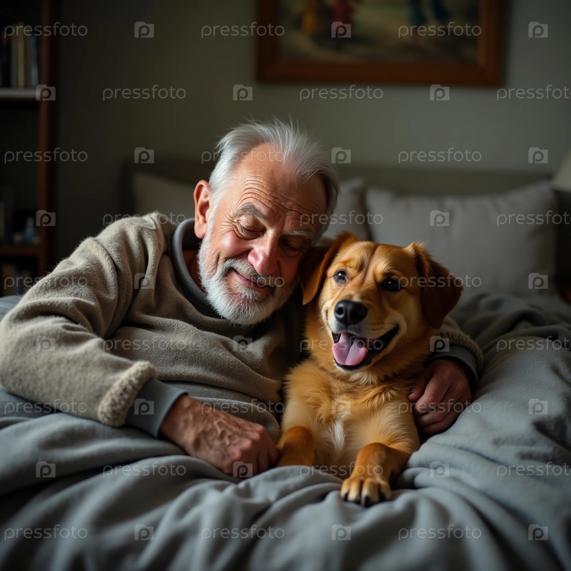 В тихой спальне, наполненной мягким светом, пожилой мужчина наслаждается простой радостью объятий со своей веселой собакой, олицетворяющей тепло, надежду и товарищество в последние годы жизни. Генеративный искусственный интеллект