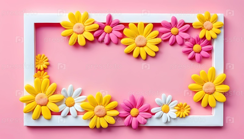 Яркие ромашки белого, желтого и розового цветов украшают причудливую рамку на нежном пастельном фоне, предлагая восхитительный холст для художественного самовыражения и вдохновения