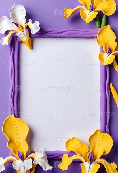 Превосходно выполненная рамка демонстрирует яркие цветы ириса белого, желтого и фиолетового цвета на контрастном фоне, побуждая к творчеству и персонализации в пустом пространстве