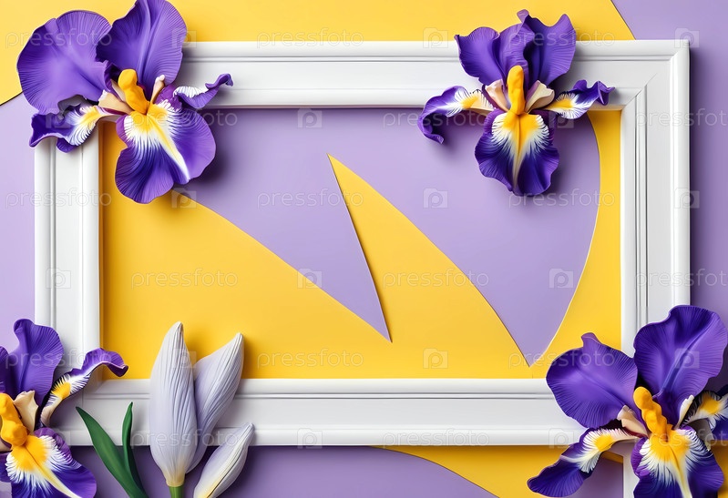 Нежные цветы ириса украшают яркую композицию, демонстрирующую белую рамку на ярком желто-фиолетовом фоне, призывая к творчеству и вдохновению в пустом пространстве