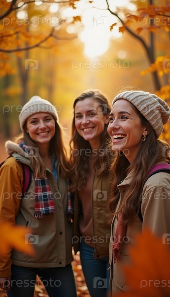 Трое друзей смеются и радуются, исследуя залитый солнцем осенний лес, окутанный ослепительной листвой и красотой природы