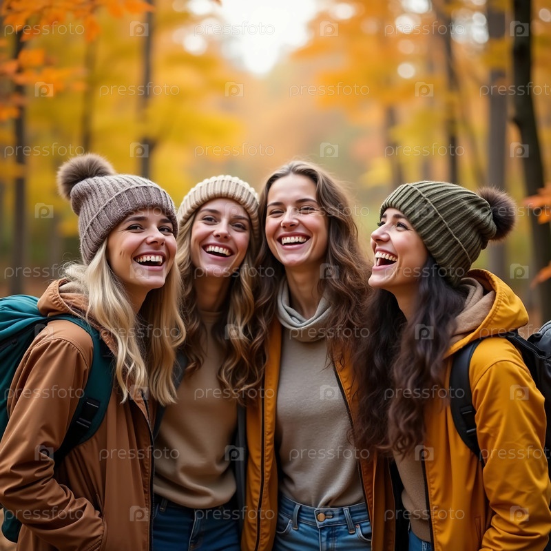 Четверо друзей наслаждаются ярким осенним днем в лесу, смеясь и наслаждаясь теплом, исследуя потрясающие пейзажи и свежий воздух в окружении золотистых листьев