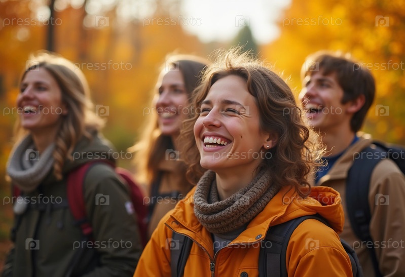 В живописном осеннем лесу друзья разделяют радостные моменты, наполненные смехом, в окружении захватывающей дух листвы и проникаясь духом приключений