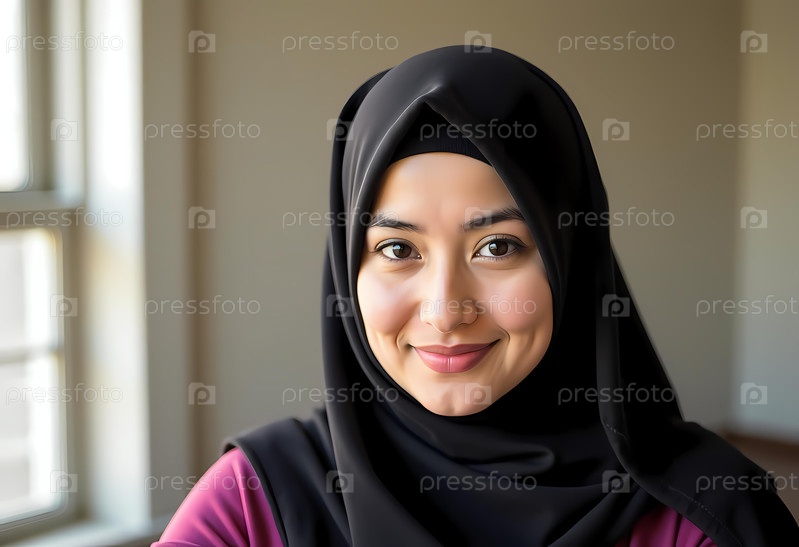 Веселая азиатка в черном хиджабе нежно улыбается, демонстрируя свою уверенность и теплоту. Естественный свет проникает через соседнее окно, усиливая мирную атмосферу