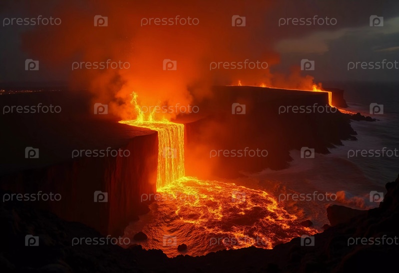 Реки светящейся магмы стремительно текут с вершин вулканов, освещая темный ландшафт, пока огненное извержение разворачивается в завораживающей демонстрации первозданной силы природы