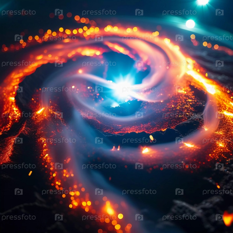 Завораживающий вихрь огненного света воспламеняет космическую тьму, открывая потрясающую игру цветов и текстур в обширной галактике Генеративный ИИ