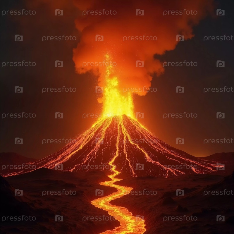 На закате величественный вулкан извергается, выбрасывая в воздух огненную магму. Реки светящейся лавы каскадом стекают с горы, освещая ночное небо оранжевыми и красными оттенками