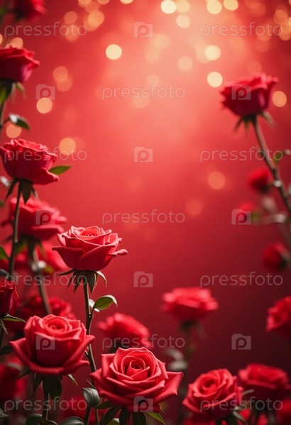 Пышные красные розы цветут страстно, бархатистые лепестки ловят нежный блеск боке огней. Очаровательная композиция завораживающая атмосфера, любовное восхищение. Пустое место приглашает сердечные сообщения AI
