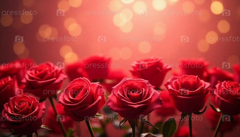Пышные красные розы цветут страстно, бархатистые лепестки ловят нежный блеск боке огней. Очаровательная композиция завораживающая атмосфера любовь восхищение. Пустое место приглашает сердечные сообщения AI
