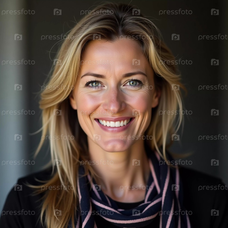В уютной обстановке помещения шведская женщина излучает радость своей яркой улыбкой и развевающимися волосами, закутанная в стильный полосатый шарф в солнечный полдень
