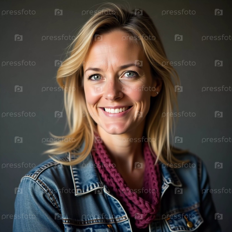 Веселая шведка позирует с яркой улыбкой, излучая тепло и уверенность. Ее повседневная одежда и успокаивающий фон создают дружелюбную и гостеприимную атмосферу