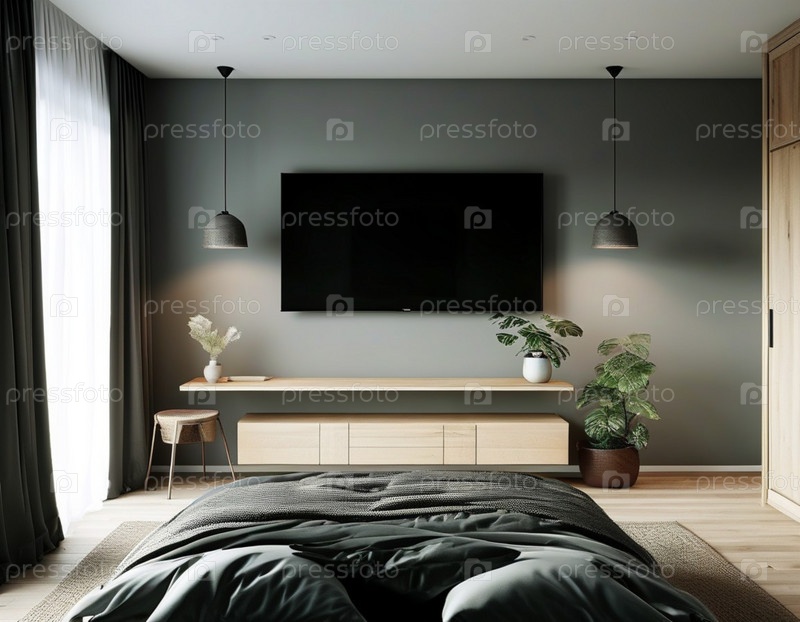 Красиво оформленная спальня в американском стиле с ярким серым, бежевым, коричневым декором, пышной зеленью и освещением для уютной атмосферы. Картина на стене, двуспальная семейная кровать. Номер в отеле на двоих. Искусство AI