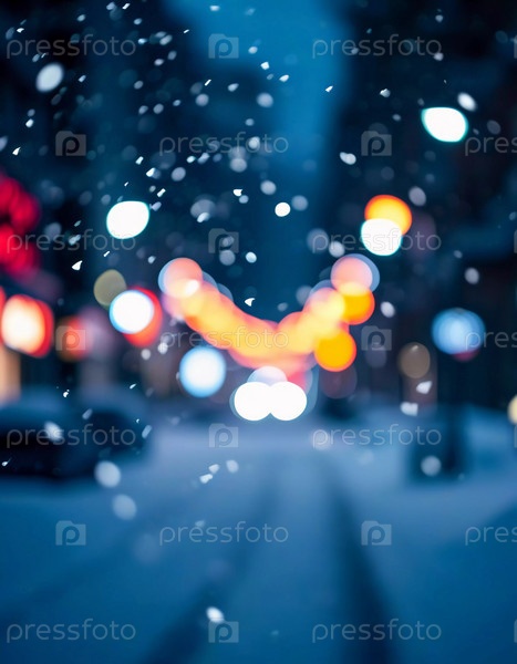 Зима приносит мягкий снегопад на городские улицы, где разноцветные огни висят над головой, создавая теплую и праздничную атмосферу. Эффект боке от огней добавляет причудливый штрих, подчеркивая радость сезона