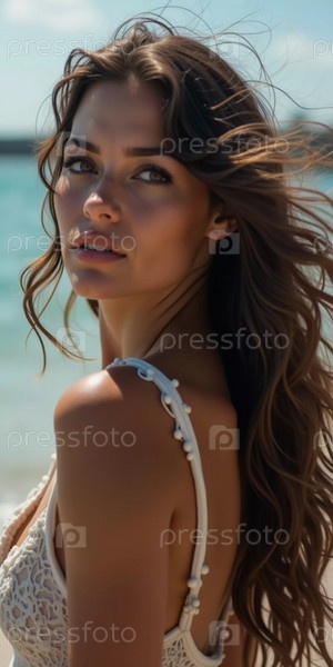 Брюнетка в купальнике смотрит назад, стоя у береговой линии. Нежные морские волны плещутся у ее ног под ясным голубым небом. Длинные волосы, красивое молодое лицо. Реклама путешествий и одежды. AI