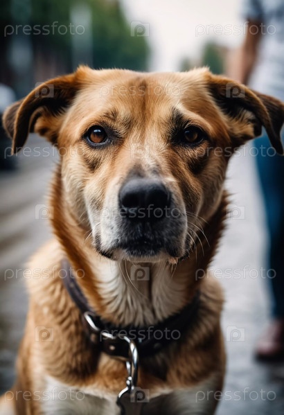 Любопытная собака стоит на оживленной улице, наблюдая за бурлящей деятельностью вокруг. Теплый дневной свет отбрасывает мягкие тени, улавливая живую атмосферу городской жизни AI