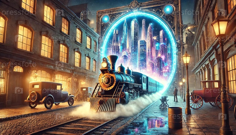 Поезд 19 го века проходит через временное окно из будущего. С одной стороны старинный город, с другой город будущего