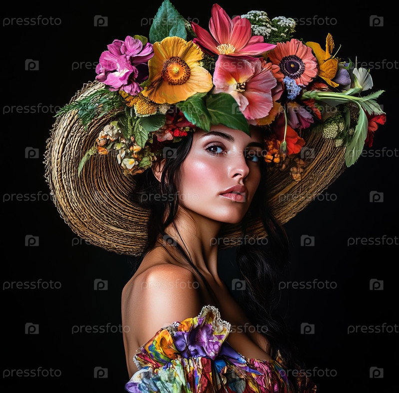 Женщина в соломенной шляпе с яркими цветами на черном фоне. Сгенерировано ИИ