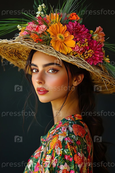 Женщина в соломенной шляпе с яркими цветами на черном фоне. Сгенерировано ИИ