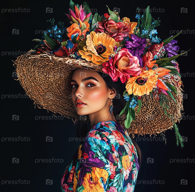 Женщина в соломенной шляпе с яркими цветами на черном фоне. Сгенерировано ИИ