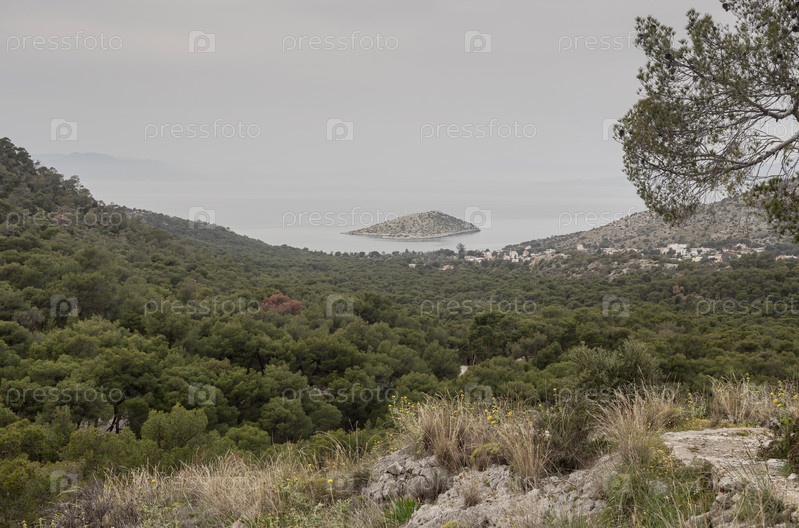 Вид сверху на сосновый лес, море и небольшой остров (Греция, остров Саламин)