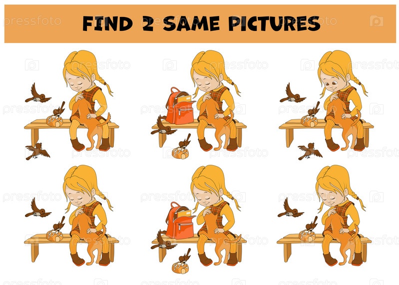 Найди две одинаковые картинки. Девочка со щенком и птицами, Найди две одинаковые картинки. Девочка со щенком и птицами