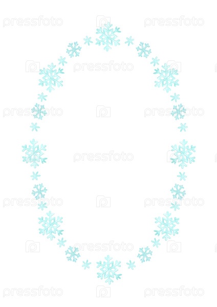 Снежинки. Примитивная акварельная рамка. Простая вертикальная овальная рамка с нарисованными от руки снежинками. Шаблон зимнего фона для открытки, тарелки или сумки с пустым местом для текста в центре