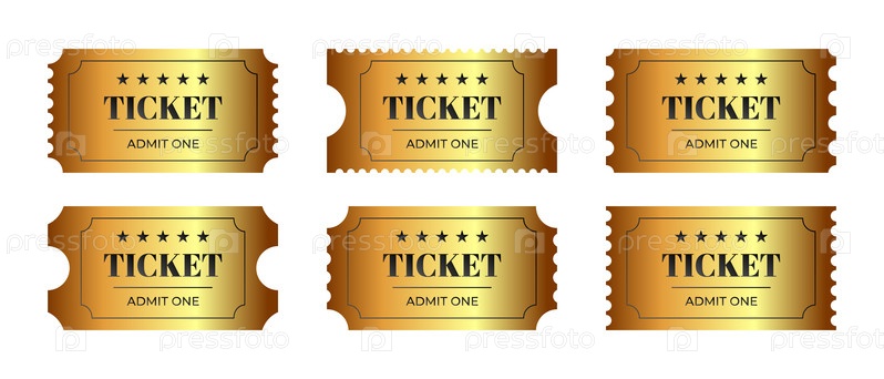 Демонстрация шести отдельных золотых билетов, предназначенных для входа на различные мероприятия, с элегантными деталями в виде звезд и смелой этикеткой билета. Они служат символами уникальных впечатлений