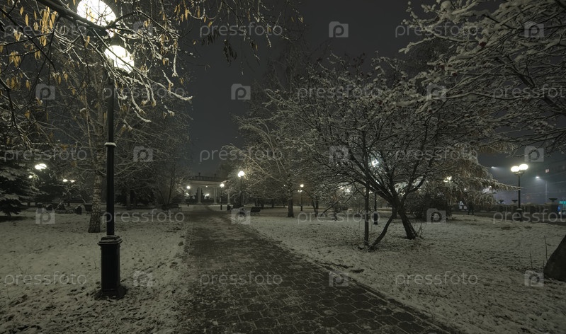 Новокузнецк, Россия. 01 ноября 2024 года. Деревья возле колоннады городского парка имени Юрия Гагарина, покрытые первым осенним снегом и подсвеченные фонарями холодного света