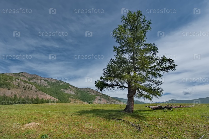 Россия, Республика Бурятия. Одинокое дерево степной долине реки Ока между заросших тайгой гор
