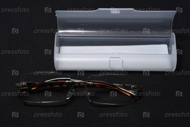 Корректирующие очки с футляром на черном фоне