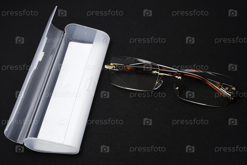 Корректирующие очки с футляром на черном фоне