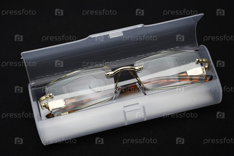 Корректирующие очки с футляром на черном фоне