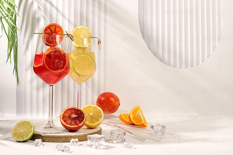 Флаер с бокалами различных алкогольных напитков и тропических фруктов. Два королевских коктейля из апельсина и лимона, кубики льда, ром и текила. Концепция летней вечеринки и отдыха в ресторане