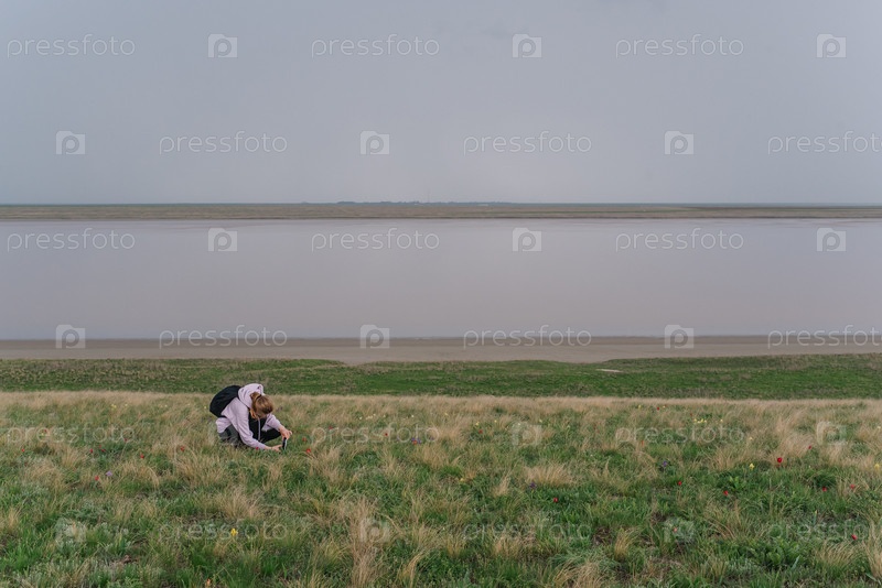Девушка с рюкзаком фотографирует цветущую степь