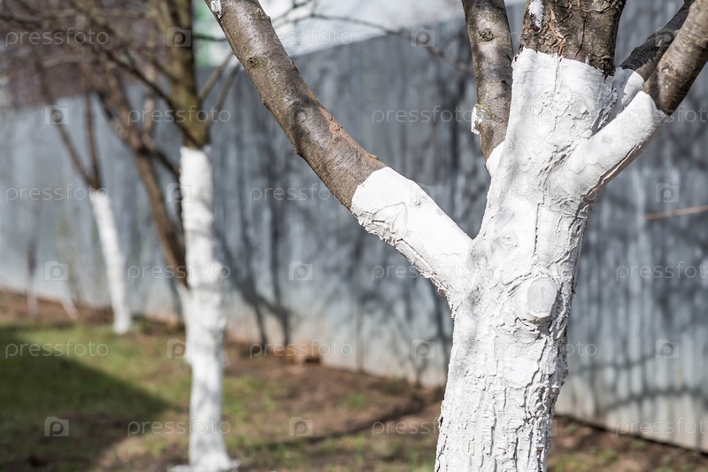 Весеннее садоводство. Побелка плодовых деревьев от насекомых и болезней. Стволы деревьев окрашены в белый цвет
