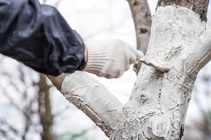 Весеннее садоводство. Побелка плодовых деревьев от насекомых и болезней. Ствол дерева и рука садовника с кистью и побелкой, красящая яблоню