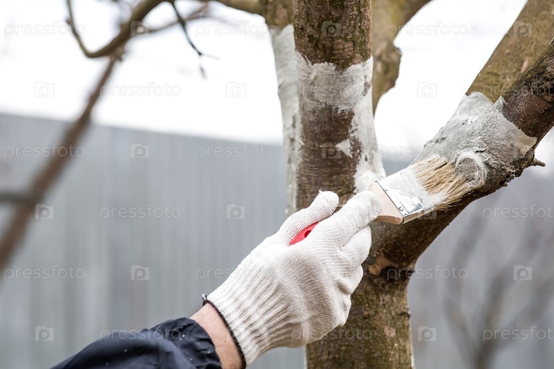 Весеннее садоводство. Побелка плодовых деревьев от насекомых и болезней. Ствол дерева и рука садовника с кистью и побелкой, красящая яблоню