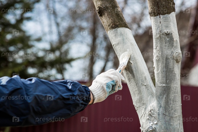 Весеннее садоводство. Побелка плодовых деревьев от насекомых и болезней. Ствол дерева и рука садовника с кистью и побелкой, красящая яблоню