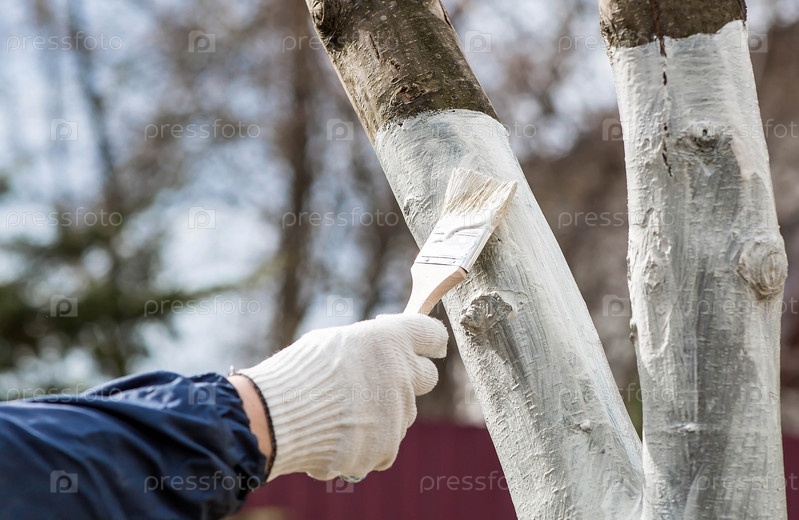 Весеннее садоводство. Побелка плодовых деревьев от насекомых и болезней. Ствол дерева и рука садовника с кистью и побелкой, красящая яблоню