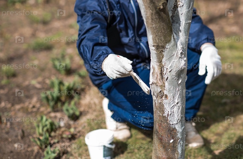 Весеннее садоводство. Побелка плодовых деревьев от насекомых и болезней. Ствол дерева и рука садовника с кистью и побелкой, красящая яблоню