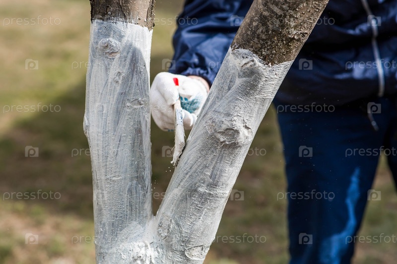 Весеннее садоводство. Побелка плодовых деревьев от насекомых и болезней. Ствол дерева и рука садовника с кистью и побелкой, красящая яблоню