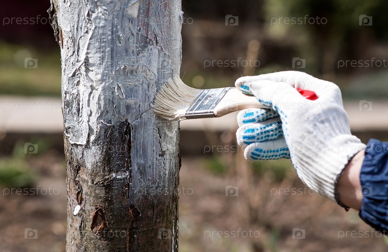 Весеннее садоводство. Побелка плодовых деревьев от насекомых и болезней. Ствол дерева и рука садовника с кистью и побелкой, красящая яблоню