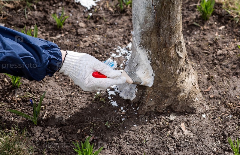 Весеннее садоводство. Побелка плодовых деревьев от насекомых и болезней. Ствол дерева и рука садовника с кистью и побелкой, красящая яблоню